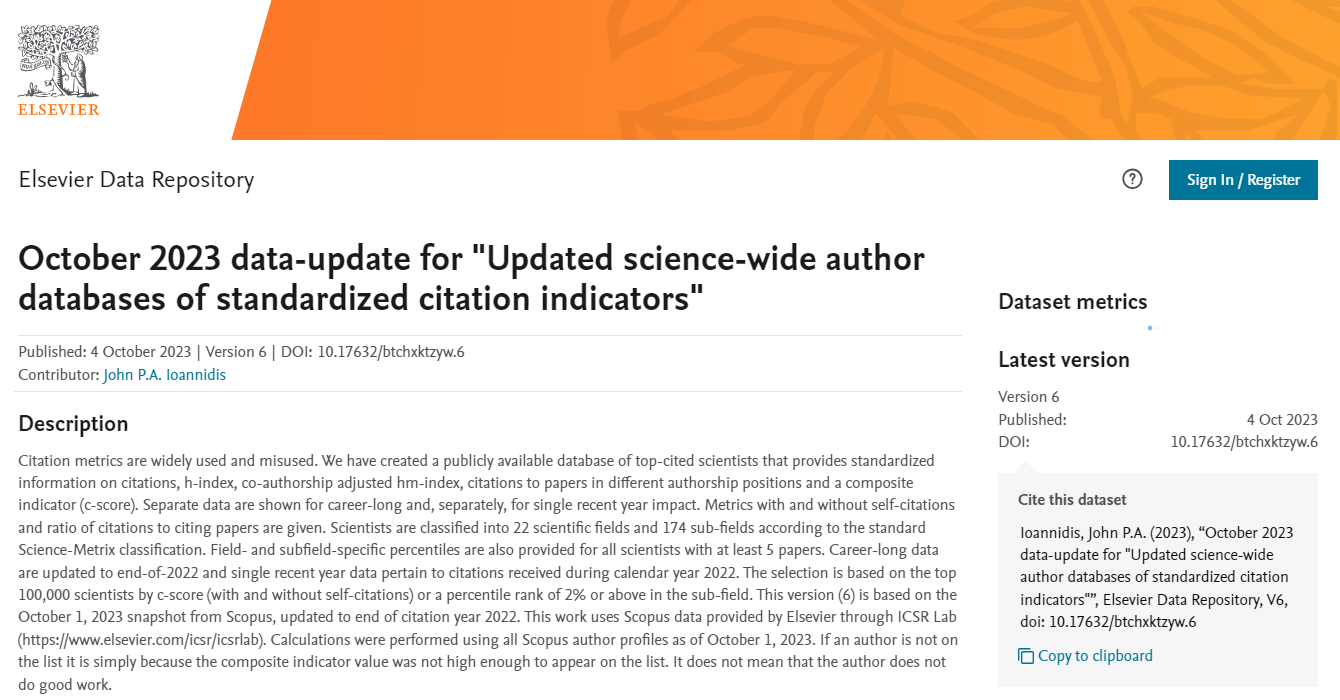 该榜单由斯坦福大学John P.A. Ioannidis教授团队联合爱思唯尔发布,基于全球约一千万科学家的论文引用数、h指数(全称“H-index”,用于评估研究人员的学术产出数量与学术产出水平)、合著者调整的hm指数、单独或第一作者的文章引用数等综合参数,反映科学家的产出量和学术影响力,收录了来自22个学科领域、176个子学科领域全球排名2%的科学家。